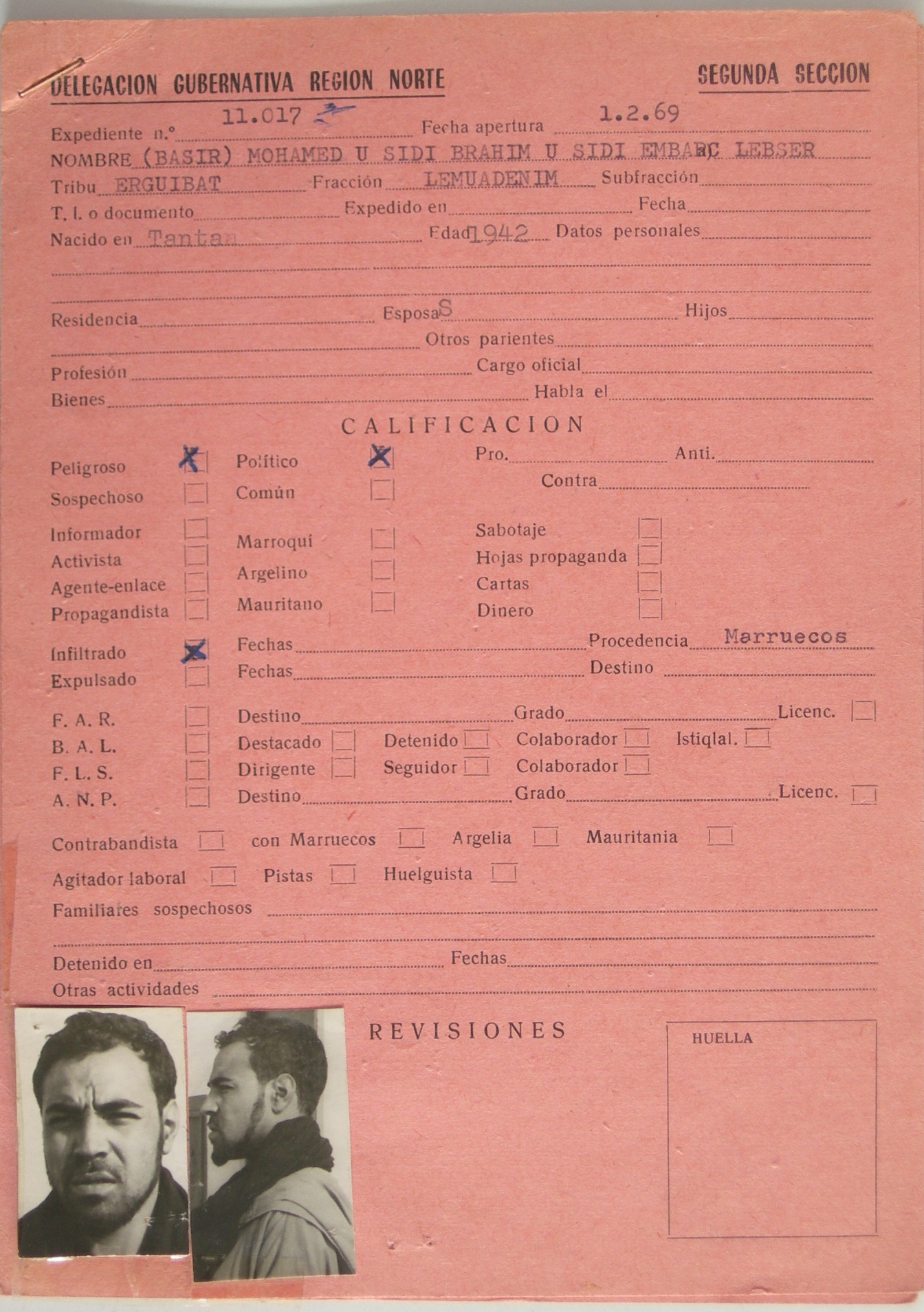 En la noche que siguió a los incidentes de Zemla (o Jatarrambla) del 17 de junio de 1970, las fuerzas de seguridad coloniales llevan a cabo una redada con el fin de detener a los dirigentes de la OALS. Entre los que ingresan en prisión se encuentra Bassiri, según consta en su ficha policial aquí adjunta. Como se puede comprobar, a la hora de marcar el tipo de crimen que se le atribuía a Bassiri, los responsables policiales no optaron por la casilla de «activista», sino la de «infiltrado», término que entonces describía la amenaza más temida por las autoridades coloniales españolas: un agente del Reino de Marruecos involucrado en actividades desestabilizadoras dirigidas a forzar la salida de España del territorio.
