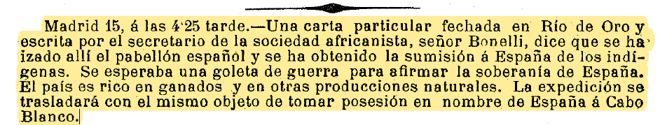 El 15 de diciembre el diario La Vanguardia anunciaba la «sumisión» de las tribus saharauis. El 26 de diciembre el Gobierno da instrucciones a sus representantes en el extranjero de que notifiquen al resto de las potencias el nuevo protectorado español en el África occidental. Texto completo de la.Real Orden de 26 de diciembre 1884.