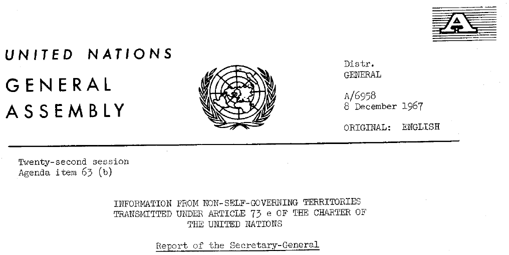 DOCUMENTO: INFORMACIÓN SOBRE LOS TERRITORIOS NO AUTÓNOMOS TRANSMITIDA EN VIRTUD DEL INCISO e DEL ARTÍCULO 73 DE LA CARTA DE LAS NACIONES UNIDAS. Informe del Secretario General A/6958 (inglés)
