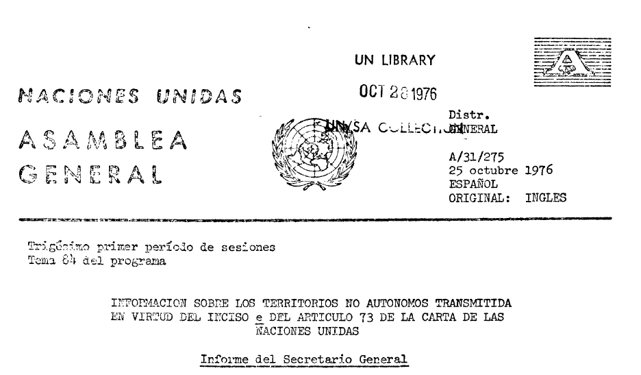 La resolución A/31275 aprobada por la Asamblea General de la ONU el 25 de octubre de 1976, confirma que el Sáhara Español sigue siendo un territorio pendiente de descolonizar de acuerdo con la legalidad internacional. En efecto, esta resolución aprueba el nuevo informe anual del secretario general sobre la situación de los Territorios No Autónomos que incluye la lista de los territorios que para las Naciones Unidas siguen pendientes de llevar a término su proceso de descolonización. Por primera vez desde la firma de la Declaración de Principios del 14 de noviembre de 1975, el secretario general da cuenta de que España se ha declarado desvinculada de sus responsabilidades de potencia administradora de acuerdo al art.73 de la Carta de la ONU ( A/31/275 ). Pese a ello, la ONU sigue situando a España en la columna de las potencias administradoras en relación al Sáhara Español.