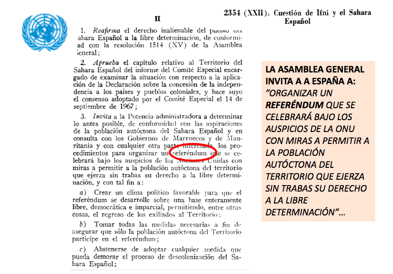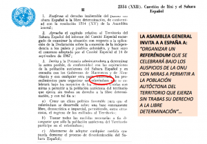 La Asamblea General exige a España que organice la votación bajo los auspcios de Naciones Unidas y «en consulta con los Gobiernos de Marruecos y de Mauritania y con cualqueir otra parte interesada». Pero, la primera condición de esta consulta, es que debe respetar las aspiraciones de la población autóctona del Sahara español.