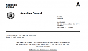 El informe también subraya que, de acuerdo a varias resoluciones, la más reciente de las cuales es la 49/39, de 9 de diciembre de 1994, la Asamblea General ha pedido a las Potencias administradoras interesadas que «transmitan o continúen transmitiendo al Secretario General la información prescrita en el inciso e del Artículo 73 de la Carta, así como la información más completa posible sobre la evolución política y constitucional de los territorios pertinentes».