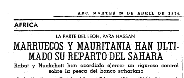 Los Gobiernos de Mauritania y Marruecos firman en abril de 1976 que se supone confirma las nuevas fronteras entre los dos países como consecuencia del reparto del Sáhara Españo. El acuerdo que adjuntamos aquí en versión inglesa.y francesa es el que corresponde a la copia que ambos Gobiernos registraron ante las Naciones Unidas el 9 de febrero de 1977, en un intento de «legalizar» ante la comunidad internacional lo que pretendía ser un tratado internacional. De hecho, el texto invoca el dictamen del Tribunal Internacional de Justicia de octubre de 1975 para asegurar que sus disposiciones cumplen con la legalidad internacional.